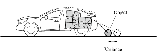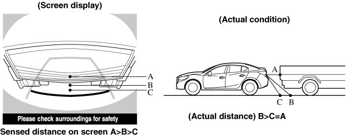 When there is a steep upgrade (downgrade) behind the vehicle, the object displayed on the screen appears farther (downgrade: closer) than the actual distance.