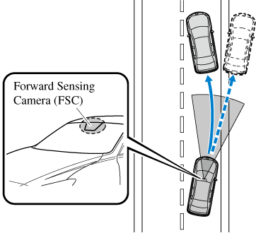 The Forward Sensing Camera (FSC) detects the white lines (yellow lines) of the vehicle lane in which the vehicle is traveling and if the system determines that the vehicle may deviate from its lane, it operates the electric power steering to assist the driver's steering operation. The system also alerts the driver by activating a lane departure warning sound, vibrating the steering wheel, and indicating an alert in the display.