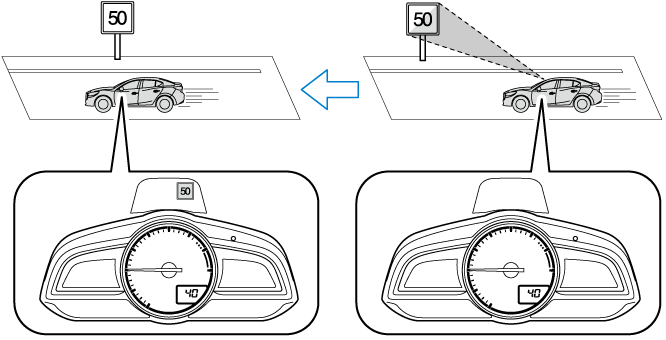 The Traffic Sign Recognition System (TSR) helps prevent the driver from overlooking traffic signs, and provides support for safer driving by displaying traffic signs on the active driving display which are recognized by the Forward Sensing Camera (FSC) or recorded in the navigation system while the vehicle is driven.