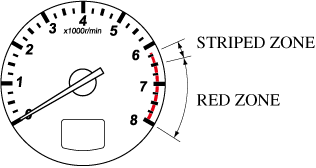 When the tachometer needle enters the STRIPED ZONE, this indicates to the driver that the gears should be shifted before entering the RED ZONE.