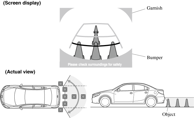 The displayable range is limited. Objects under the bumper or around the bumper ends cannot be displayed.