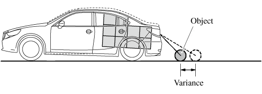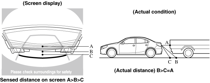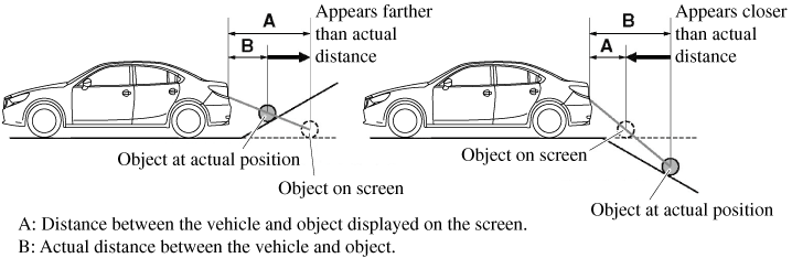 When there is a steep upgrade (downgrade) behind the vehicle, the object displayed on the screen appears farther (downgrade: closer) than the actual distance.