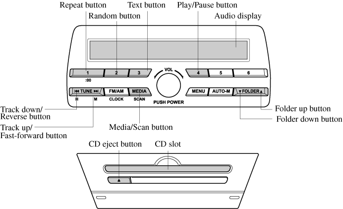 Insert the CD into the slot, label-side up. The auto-loading mechanism will set the CD and begin play.
