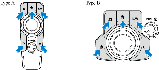 : Displays the Favorites screen. Long-press to store particular items in Favorites. (Radio, phonebook and destination of the navigation system can be programmed.)