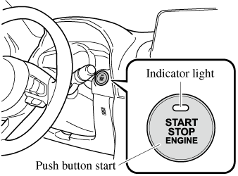 The engine starts by pressing the push button start while depressing the clutch pedal (manual transaxle) or the brake pedal (automatic transaxle). To switch the ignition position, press the push button start without depressing the pedal.