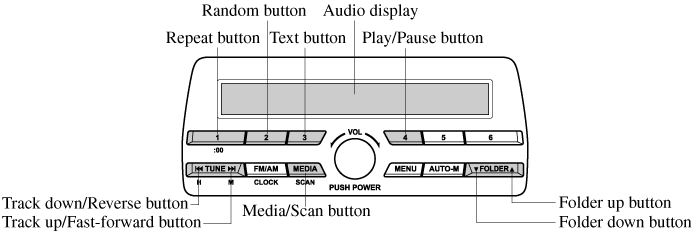 Only 13 characters can be displayed at one time. To display the rest of the characters of a long title, press and hold the text button (3). The display scrolls the next 13 characters. Press and hold the text button (3) again after the last 13 characters have been displayed to return to the beginning of the title.