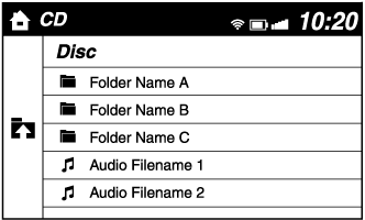 (Music CD) Displays the track list of the CD. Select the track you want to play. (MP3/WMA/AAC CD) Displays the top level folder/file list. Select the folder you want to select. The files in the selected folder are displayed. Select the file you want to play. |