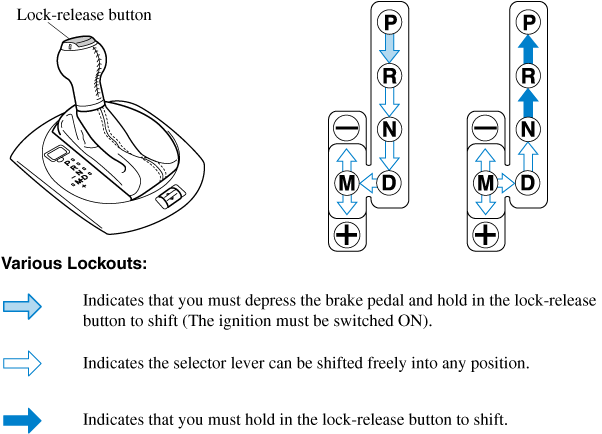 The Sport AT has an option that is not included in the traditional automatic transmission that gives the driver the option of selecting each gear instead of leaving it to the transmission to shift gears. Even if you intend to use the automatic transmission functions as a traditional automatic, you should also be aware that you can inadvertently shift into manual shift mode and an inappropriate gear may be retained as the vehicle speed increases. If you notice the engine speed going higher or hear the engine racing, confirm you have not accidentally slipped into manual shift mode (Search).