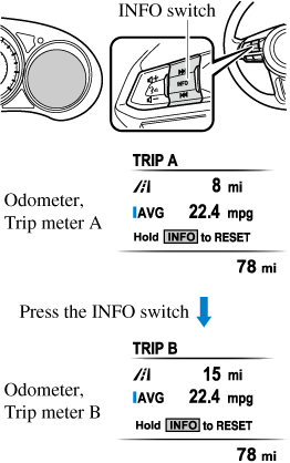 The trip meter and average fuel economy can be reset by pressing the INFO switch for 1.5 seconds or more while in each mode.