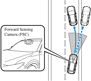 The Forward Sensing Camera (FSC) detects the white lines (yellow lines) of the vehicle lane in which the vehicle is traveling and if the system determines that the vehicle may deviate from its lane, it operates the electric power steering to assist the driver's steering operation. The system also alerts the driver by activating a lane departure warning sound, vibrating the steering wheel, and indicating an alert in the display. Use the system when you drive the vehicle on roads with white (yellow) lines such as expressways and highways.