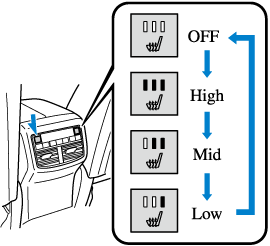 Press the seat warmer switch while the ignition is switched ON to operate the seat warmer. The indicator lights turn on to indicate that the seat warmer is operating. The mode changes as follows each time the seat warmer switch is pressed.