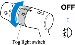 The fog lights turn on when the fog light switch is turned to the position and turn off when the switch is turned to the position.