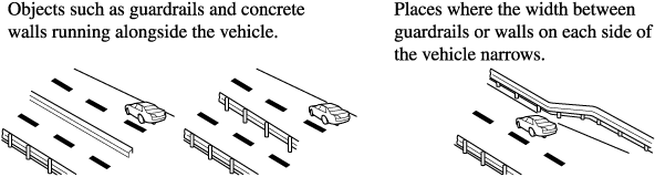 The BSM warning indicator light may turn on and the vehicle detection screen may be displayed in the display in reaction to stationary objects (guardrails, tunnels, sidewalls, and parked vehicles) on the road or the roadside.