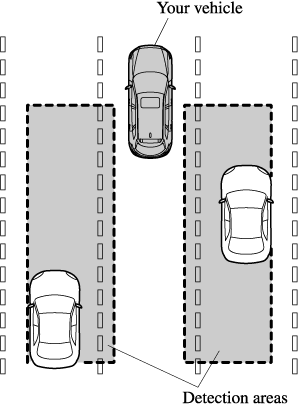 The detection area on this system covers the driving lanes on both sides of the vehicle and from the rear part of the front doors to about 50 m (164 ft) behind the vehicle.