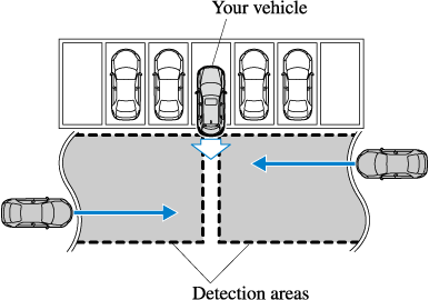 The RCTA system detects vehicles approaching from the rear left and right sides of the vehicle, and the rear of the vehicle while the vehicle is being reversed out of a parking space, and notifies the driver of possible danger using the Blind Spot Monitoring (BSM) warning indicator lights and the warning buzzer.