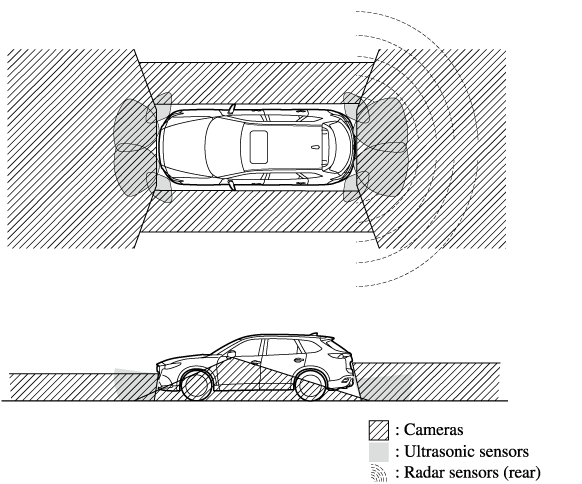 The shooting range of the cameras and detection range of the sensors are limited. For example, the areas in black at the front and rear of the vehicle image and the seams where each of the camera images merge are blind spots where an obstruction may not be visible. In addition, the extended vehicle width lines and projected vehicle path lines are only to be used as references, and the images on the screen may differ from the actual conditions.