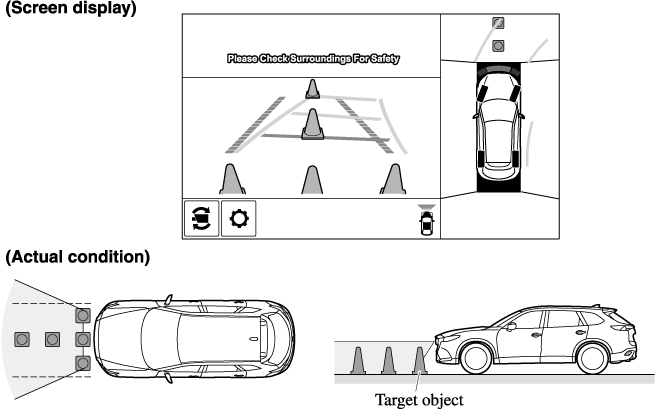 The parking sensor detection range has limitations. For example, obstructions closing in from the side and objects short in height may not be detected. Always confirm the safety around the vehicle visually when driving.