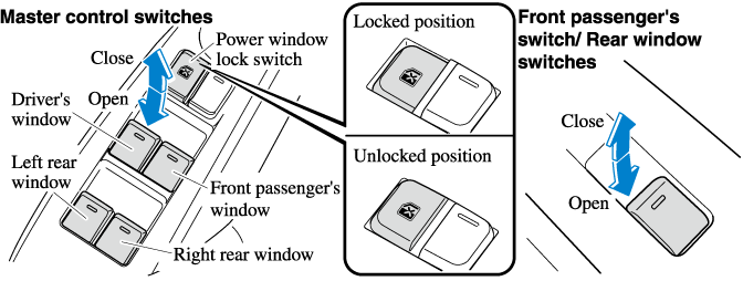 The front passenger's side and rear windows can be opened/closed when the power window lock switch on the driver's door is in the unlock position. Keep this switch in the locked position while children are in the vehicle.