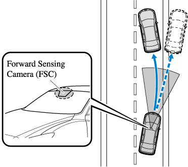 The Forward Sensing Camera (FSC) detects the white lines (yellow lines) of the vehicle lane in which the vehicle is traveling and if the system determines that the vehicle may deviate from its lane, it operates the electric power steering to assist the driver's steering operation. The system also alerts the driver by activating a lane departure warning sound, vibrating the steering wheel, and indicating an alert in the display. Use the system when you drive the vehicle on roads with white (yellow) lines such as expressways and highways.