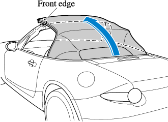 Standing outside of the vehicle, hold the convertible top along the front edge and pull it towards the vehicle front.
