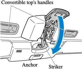 The convertible top may be constricted if it is left retracted for a long period. Therefore, if the top has become constricted, it may be difficult to hook the top latch striker to the anchor.
