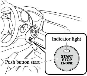 If the KEY warning light (red) illuminates, or the push button start indicator light (amber) flashes, this could indicate that the engine may not start using the usual starting method. Have your vehicle inspected at an Authorized Mazda Dealer as soon as possible. If this occurs, the engine can be force-started. Press and hold the push button start until the engine starts. Other procedures necessary for starting the engine, such as having the key in the cabin, and depressing the clutch pedal (manual transmission) or the brake pedal (automatic transmission) are required.