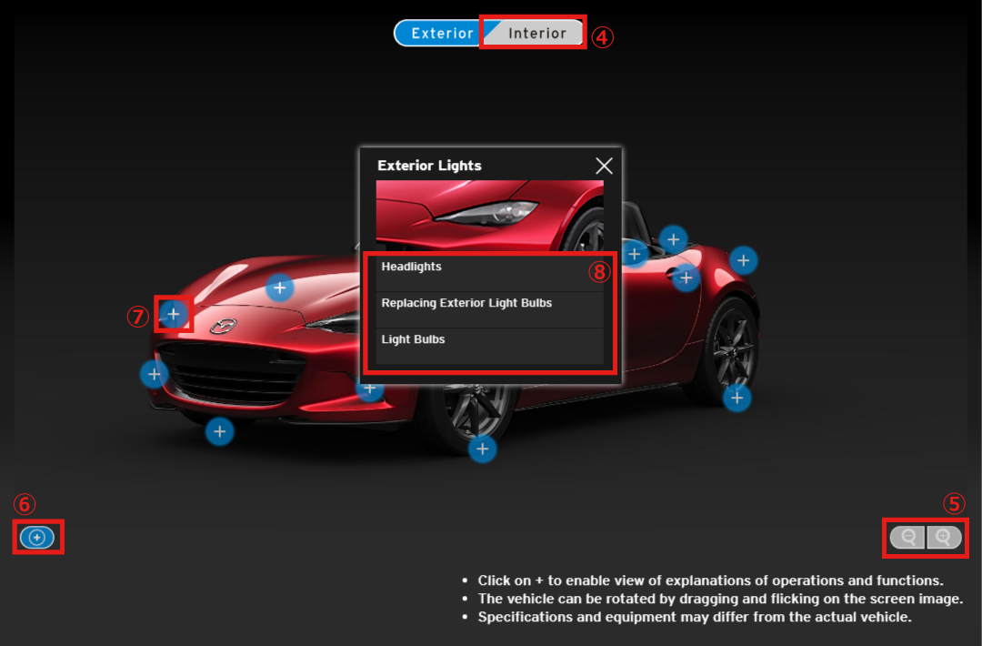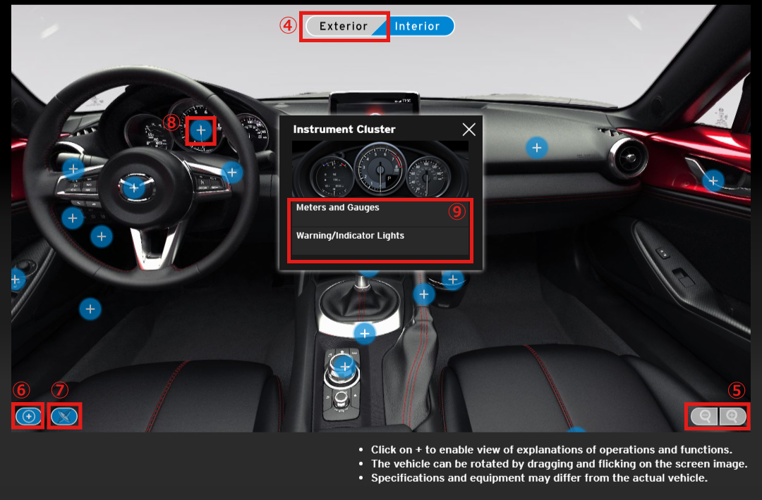 In addition, if you are using a mobile phone or other computer device which has a gyroscope function, the angles in the interior of the vehicle can be switched by moving the device (vehicle interior images only).