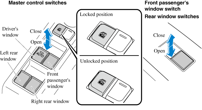 The passenger windows may be opened or closed using the master control switches on the driver's door.