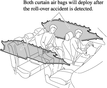 When the air bag crash sensors detect a side impact of greater than moderate force, the curtain air bag inflates quickly and helps to reduce injury mainly to the rear outboard passenger's head caused by directly hitting interior parts such as a door or window.