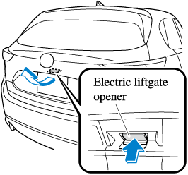The liftgate can be closed when the doors are locked with the key left in the vehicle. However, to prevent locking the key in the vehicle, the liftgate can be opened by pressing the electric liftgate opener. If the liftgate cannot be opened despite doing this procedure, first push the liftgate completely closed, then press the electric liftgate opener to fully open the liftgate.