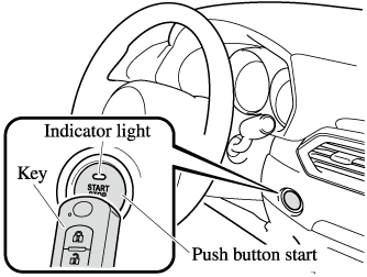 If there is a malfunction with the push button start function, the push button start indicator light (amber) flashes. In this case, the engine may start, however, have the vehicle checked at an Authorized Mazda Dealer as soon as possible.