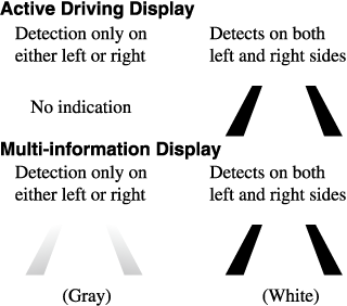 When the LAS & LDWS becomes operational while on standby, the vehicle lane lines are displayed in the multi-information display and the active driving display. In the vehicle lane lines display indicating the operation status, the color of the vehicle lane lines being detected changes to white.