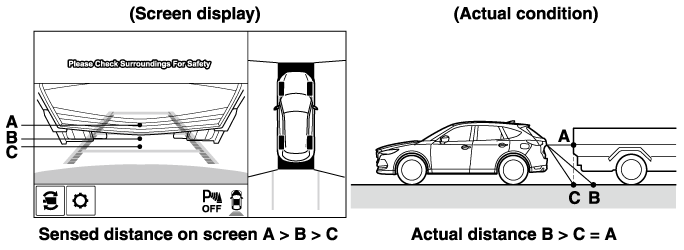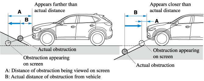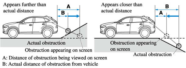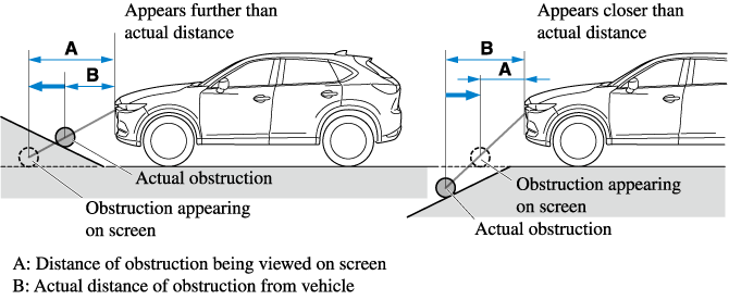 If the vehicle is on a slope, obstructions taken by the camera can appear farther or closer than the actual distance from the vehicle.