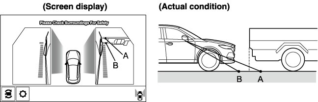 Because the vehicle front end guide lines (side camera) or the distance guide lines (rear camera) are displayed based on a flat surface, the distance to the three-dimensional object displayed on the screen is different from the actual distance.