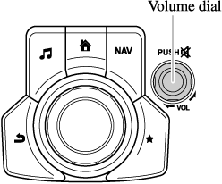 Press the volume dial to mute and pause. However, while an audio source which cannot be paused such as FM radio is playing, only mute is available. Press the volume dial again to resume the audio.