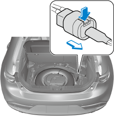 Turn the spare tire hold-down bolt counterclockwise and remove the sub-woofer and the spare tire.
