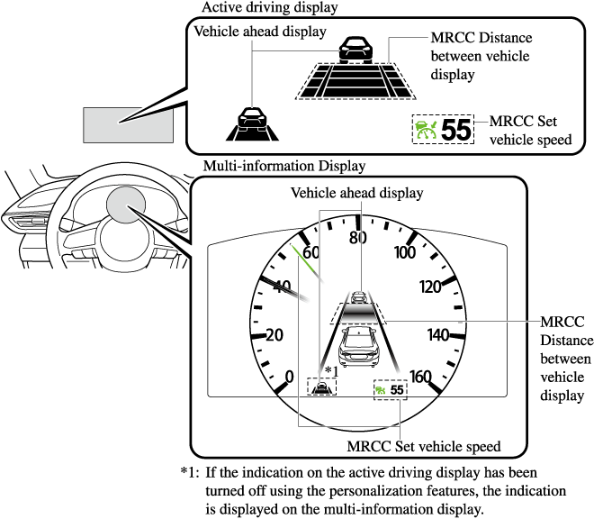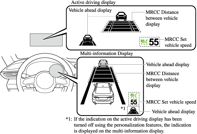 The MRCC with Stop & Go function setting status and operation conditions are indicated on the multi-information display and the active driving display.