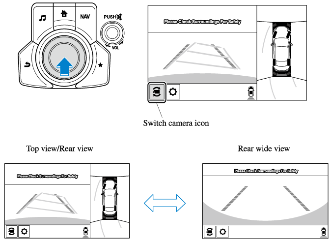 The displayed screen can be switched by pressing the commander knob or by touching the switch camera icon on the screen while the top view/rear view, rear wide view is displayed.