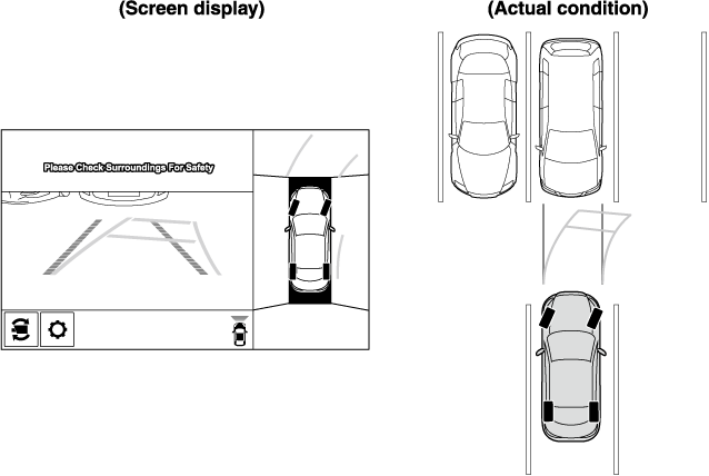 In the top view screen, the areas in black at the front and rear of the vehicle image and the seams where each of the camera images merge are blind spots.