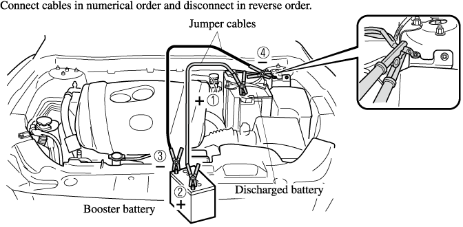 Turn off the booster vehicle's engine and connect the jumper cables in the following order.