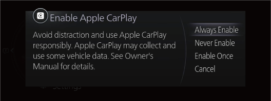 Always Enable: Enables Apple CarPlay™ each time without a confirmation.