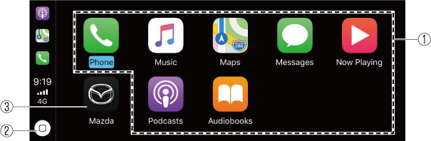 is displayed on the Mazda Connect home screen while Apple CarPlay™ is connected or press and hold the Home button.