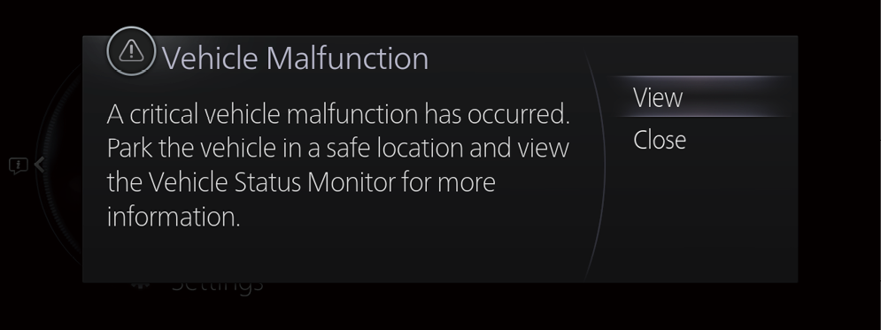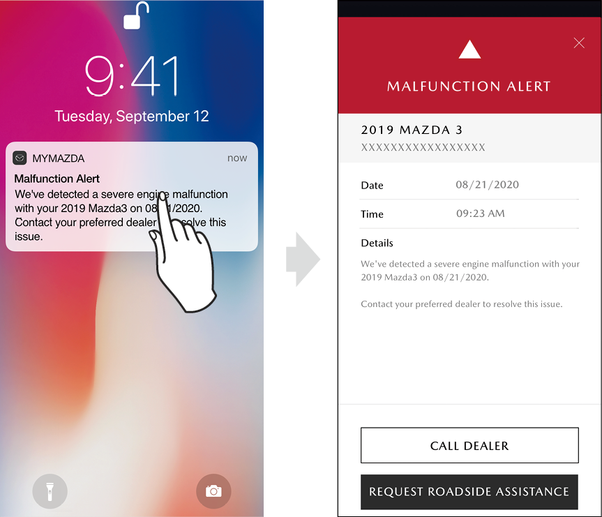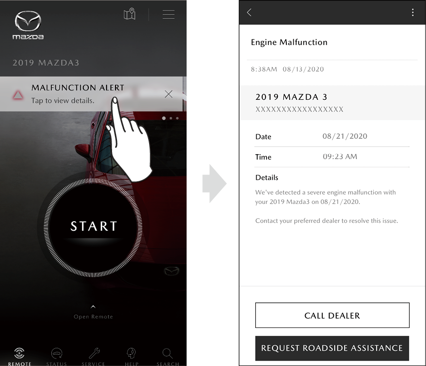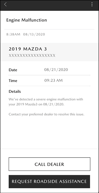 If the vehicle cannot be driven due to a certain malfunction, the device receives information about the malfunction and a notice will be displayed without having to launch the MyMazda APP. Touching the notice on the display shows the details of the malfunction.