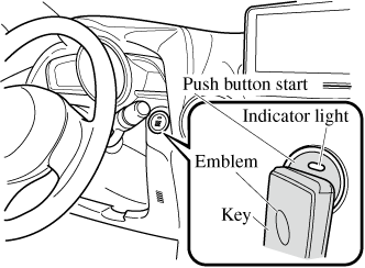 If there is a malfunction with the push button start function, the push button start indicator light (amber) flashes. In this case, the engine may start, however, have the vehicle checked at an Authorized Mazda Dealer as soon as possible.