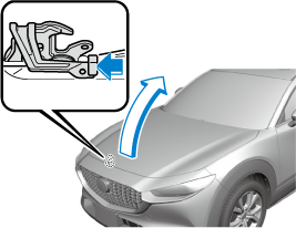 Insert your hand into the hood opening, slide the latch lever in the direction of the allow as shown in the illustration, and lift up the hood.