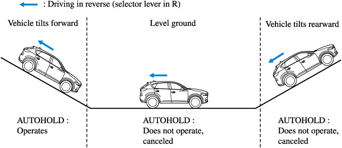 The AUTOHOLD is canceled when the selector lever is shifted to R position while the vehicle is on level ground, or facing up a hill or grade (as shown below).