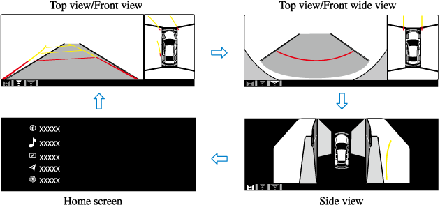 The displayed screen can be changed each time the 360°view monitor switch is pressed.