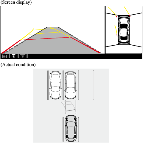 Indicates the approximate projected path of the vehicle. Moves in conjunction with the steering wheel operation. a) Indicates the path where the edge of the front bumper is expected to travel. b) Indicates the path where the inner side of the vehicle is expected to travel. |