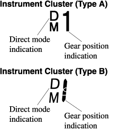 While in direct mode, the D and M indication illuminate and the gear position in use is illuminated.
