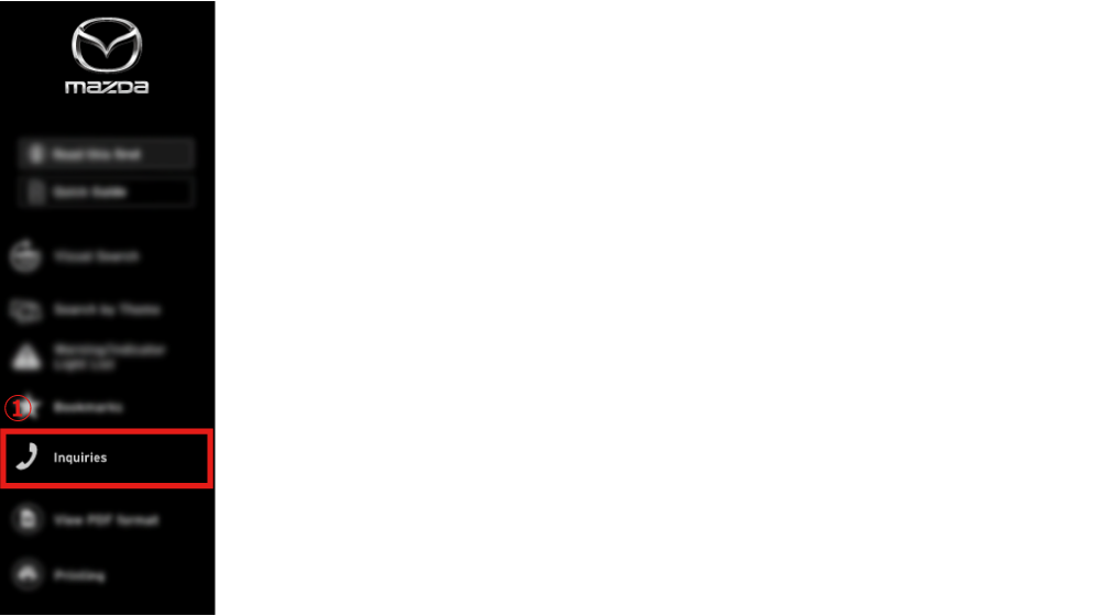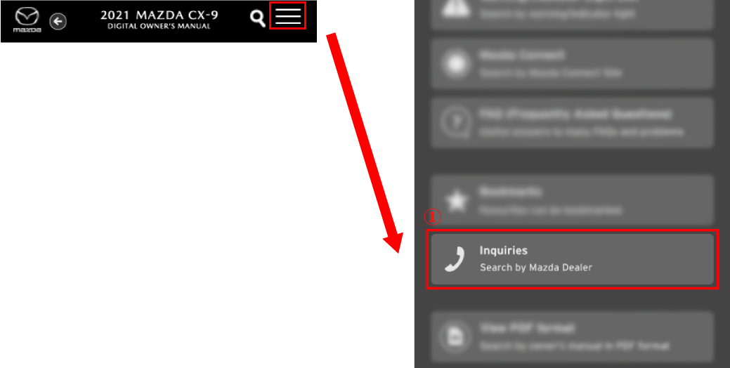 The search engine for Mazda Dealers is displayed when selecting Inquiries from the menu.